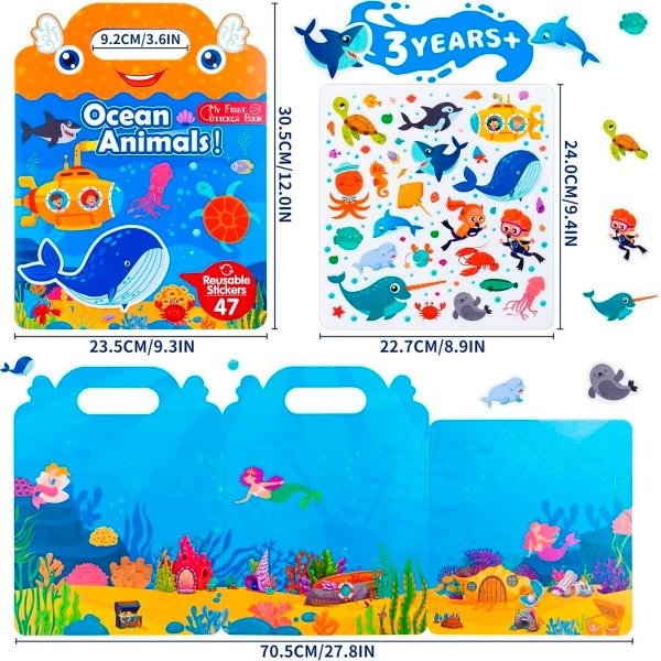 VIENE UNA PLANCHA DE STICKERS RESISTENTES Y RECICLABLES DE 47 IMÁGENES, QUE LUEGO PUEDEN DEJARSE GUARDADAS EN UNA DE LAS HOJAS Y REUTIZARSE.