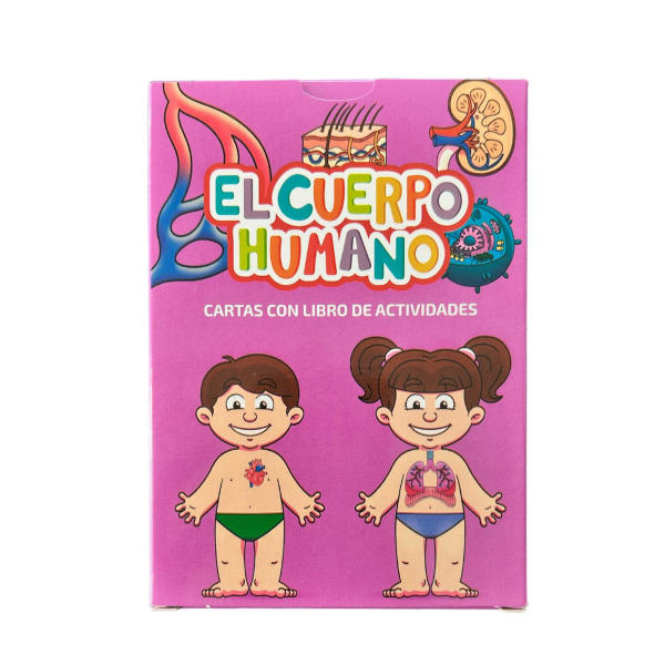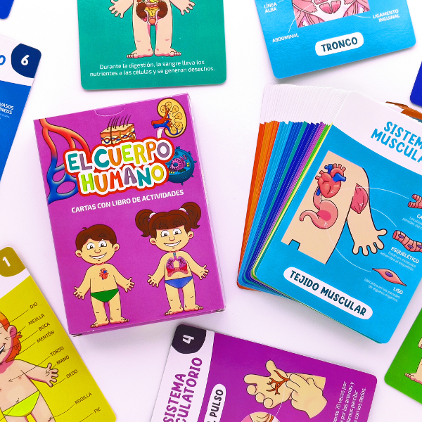 Las cartas del cuerpo humano traen en su dorso datos curiosos para aprender aún más y también vienen con un libro lleno de actividades.